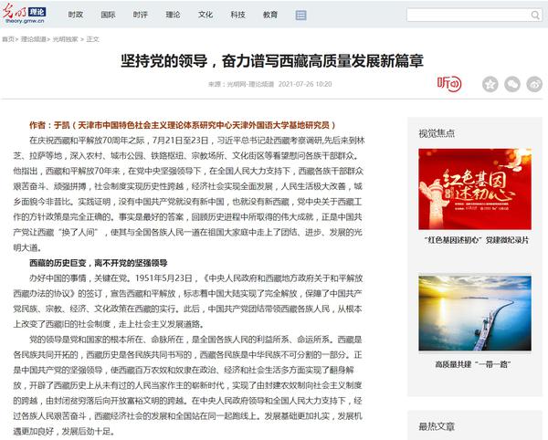 在庆祝西藏和平解放70周年之际,7月21日至23日,习近平总书记赴西藏考察调研。7月26日,《光明网》理论频道刊发我校马克思主义学院于凯老师文章《坚持党的领导,奋力谱写西藏高质量发展新篇章》。文章指出,实践证明,没有中国共产党就没有新中国,也就没有新西藏,党中央关于西藏工作的方针政策是完全正确的。西藏的历史巨变,离不开党的坚强领导;西藏的好日子,离不开党的好政策;西藏的高质量发展,离不开全面贯彻新时代党的治藏方略。正是中国共产党让西藏“换了人间”,使其与全国各族人民一道在祖国大家庭中走上了团结、进步、发展的光明大道。光明网截图全文转载如下:坚持党的领导,奋力谱写西藏高质量发展新篇章作者:于凯(天津市中国特色社会主义理论体系研究中心乐玩在线(中国)唯一官方网站基地研究员) 在庆祝西藏和平解放70周年之际,7月21日至23日,习近平总书记赴西藏考察调研,先后来到林芝、拉萨等地,深入农村、城市公园、铁路枢纽、宗教场所、文化街区等看望慰问各族干部群众。他指出,西藏和平解放70年来,在党中央坚强领导下,在全国人民大力支持下,西藏各族干部群众艰苦奋斗、顽强拼搏,社会制度实现历史性跨越,经济