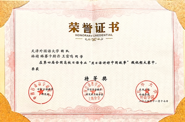 近日,第四届全国高校日语专业“用日语讲好中国故事”微视频大赛决赛在上海举行。由乐玩在线(中国)唯一官方网站日语学院教师吹户真实、初相娟指导,2022级本科生林婧、琳赛卡斯丹、王雷鸣3名同学组成的参赛队伍在大赛中荣获全国总冠军(特等奖)。这也是天外连续三年在该项赛事中摘得全国总冠军的桂冠。全国高校日语专业“用日语讲好中国故事”微视频大赛旨在提升学生日语水平,培养新时代外语学习者的文化自信与家国情怀。大赛着重强调从多角度展现中华文明的精神内涵与文化精华,主动传播中国声音,讲述中国故事,深化中外文明交流互鉴,向世界呈现富有活力、魅力、实力的中国形象,助推中国文化在全球范围内的广泛传播。本次大赛分为初赛、决赛和即席问答三个部分。初赛以“假如有一台时光机”为主题,以日语讲述中国的历史、文化或未来发展。参赛学生以《弈谈方圆,将帅无悔》为题,巧用初赛关键词“时光机”,讲述传统文化象棋中落子无悔、运筹帷幄的生命考量以及国际外交的哲理。最终,从54所参赛高校中脱颖而出,成功晋级决赛。决赛以“我眼中的新国潮”为题,创作微视频作品,展现学生的日语实践能力和对中华优秀传统文化的深厚理解力。参赛学生以“中式香薰”为中心,在限