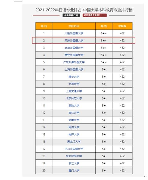 近日,根据“金平果”中国科教评价网、杭州电子科技大学中国科教评价研究院、浙江高等教育研究院、武汉大学中国科学评价研究中心等机构全面、系统、客观、公正评价,《中国大学及学科专业评价报告(2021-2022)》权威发布,我校日语专业获评“五星+”级专业,在全国462所开设日语专业的高校中荣居第二位。