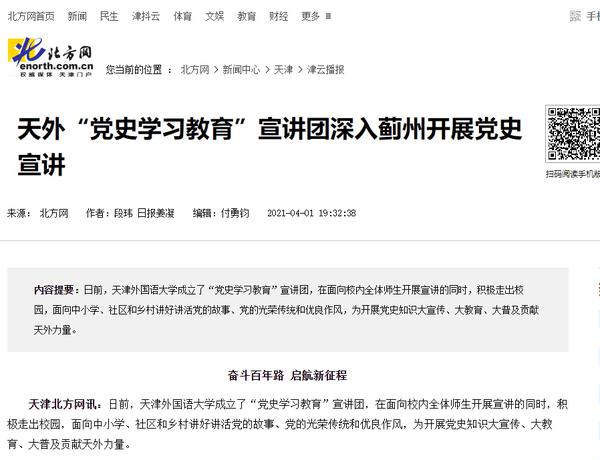 4月1日,北方网以《天外“党史学习教育”宣讲团深入蓟州开展党史宣讲》为题进行了报道。