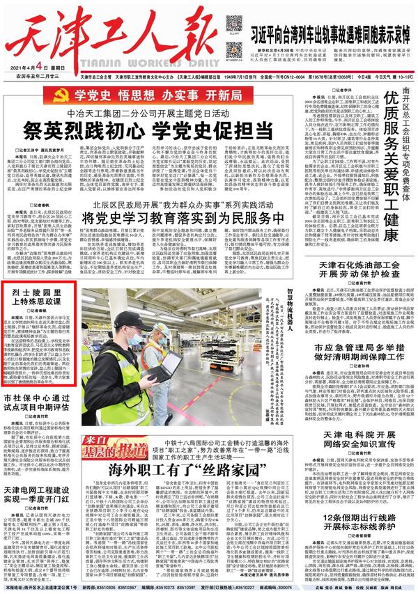 4月4日,《天津工人报》头版以《烈士陵园里上特殊思政课》为题进行了报道。