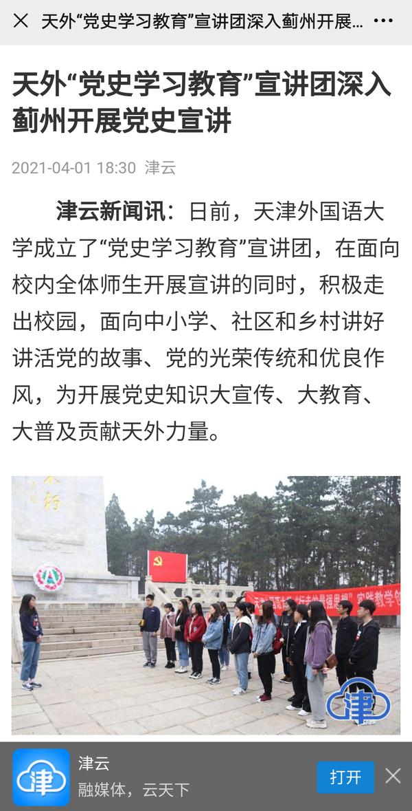 4月1日,“津云”客户端以《天外“党史学习教育”宣讲团深入蓟州开展党史宣讲》为题进行了报道。