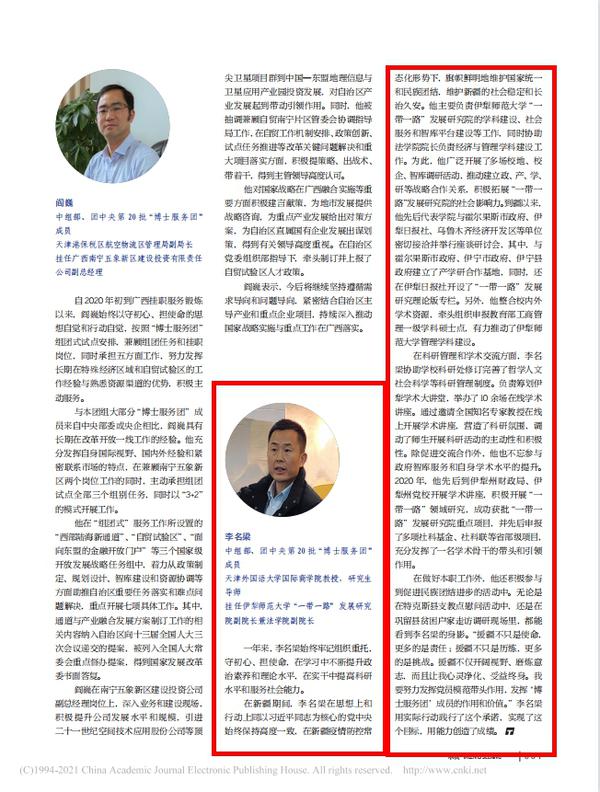 自 2020 年初到广西挂职服务锻炼以来,阎巍始终以守初心、担使命的思想自觉和行动自觉,按照“博士服务团”组团式试点安排,兼顾组团任务和挂职岗位,同时承担五方面工作,努力发挥长期在特殊经济区域和自贸试验区的工作经验与熟悉资源渠道的优势,积极主动服务。