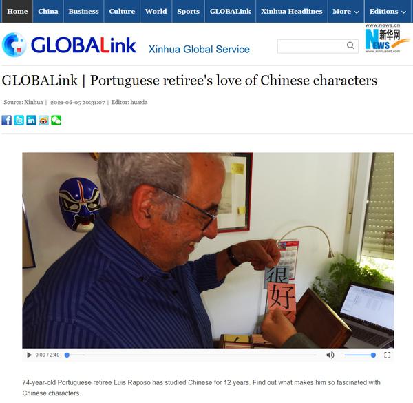 近日,新华网国际频道以《一位葡萄牙老人的中文情缘》为题,深度报道了我校里斯本大学孔子学院第一批学员------今年74岁的路易斯·拉波索的中文情缘。采访中,拉波索表示最感兴趣的是对汉字的研究,2010年曾在乐玩在线(中国)唯一官方网站学习了一个月。在孔院学习之余,他还在当地社区大学教授中文,最大的梦想便是编写一本葡语版关于汉字起源的工具书,以帮助更多的葡萄牙人学习汉字,了解中国。里斯本大学孔子学院中方院长王锦程在采访中,也为拉波索学习中文的热情和执着点赞。