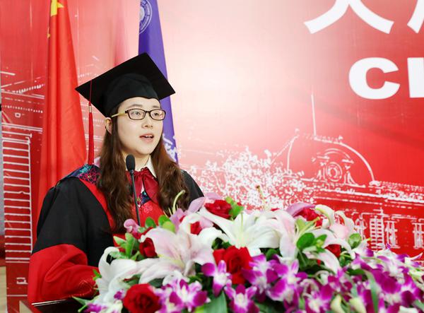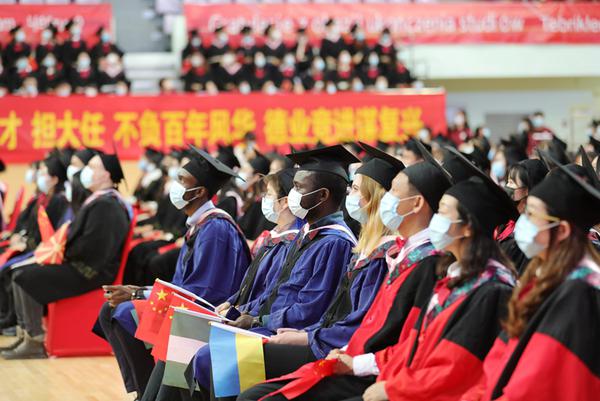 在激昂奋进的音乐声中,主席台领导依次为中央文献对外翻译研究领域第五届博士研究生、本硕毕业生及来自法国、乌克兰、埃及、罗马尼亚、厄瓜多尔、尼日利亚、马其顿等国的留学生颁发毕业证书。