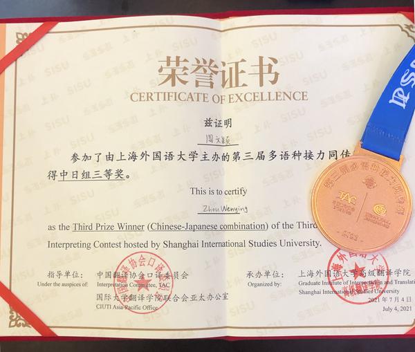 由上海外国语大学主办,国际大学翻译学院联合会亚太办公室和中国翻译协会口译委员会指导的“上海外国语大学第三届多语种接力同传赛”决赛于7月4日举行。我校高级翻译学院2019级日语同传方向周文颖同学经过激烈角逐,荣获三等奖,指导教师蒋芳婧教授获评“优秀指导教师”。