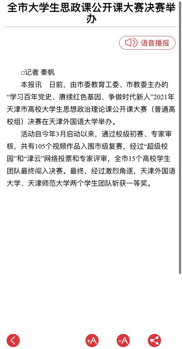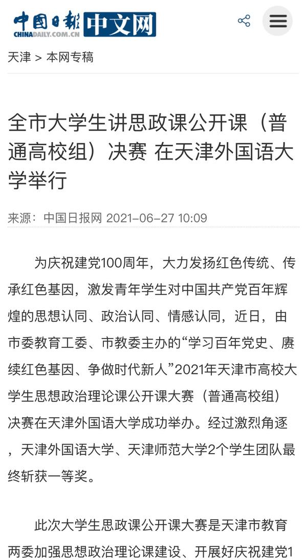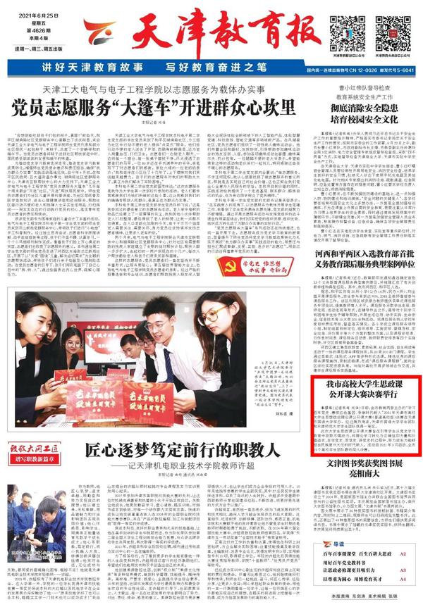 6月25日,《天津教育报》头版以《我市高校大学生思政课公开课大赛决赛举行》为题目进行了报道。