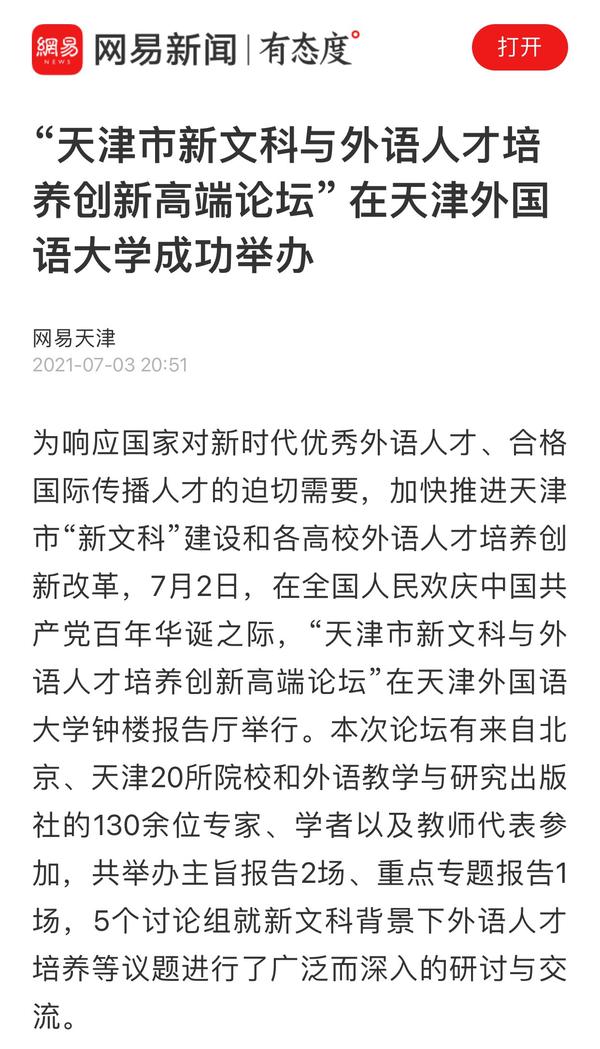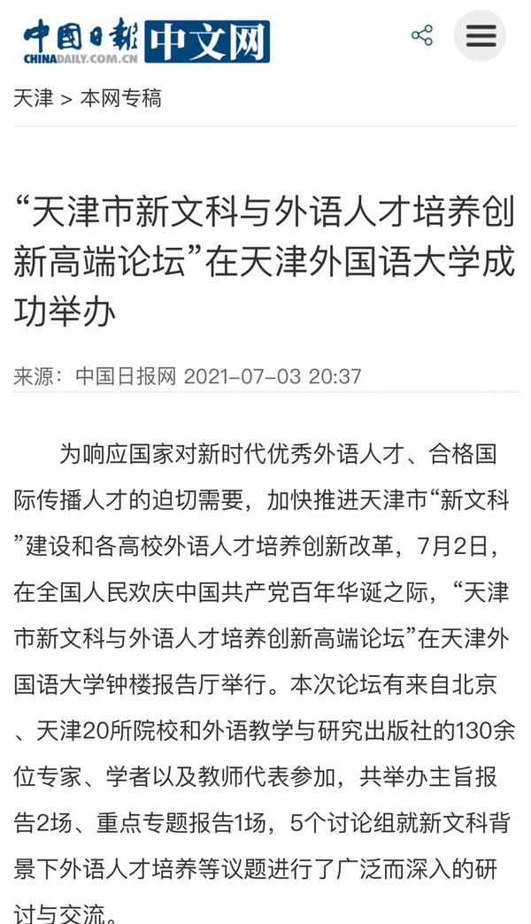 7月3日,中国日报网、网易新闻等媒体分别以《“天津市新文科与外语人才培养创新高端论坛” 在乐玩在线(中国)唯一官方网站成功举办》为题进行了报道。
