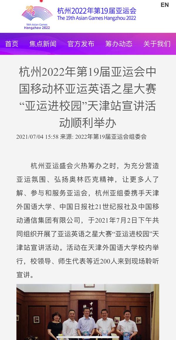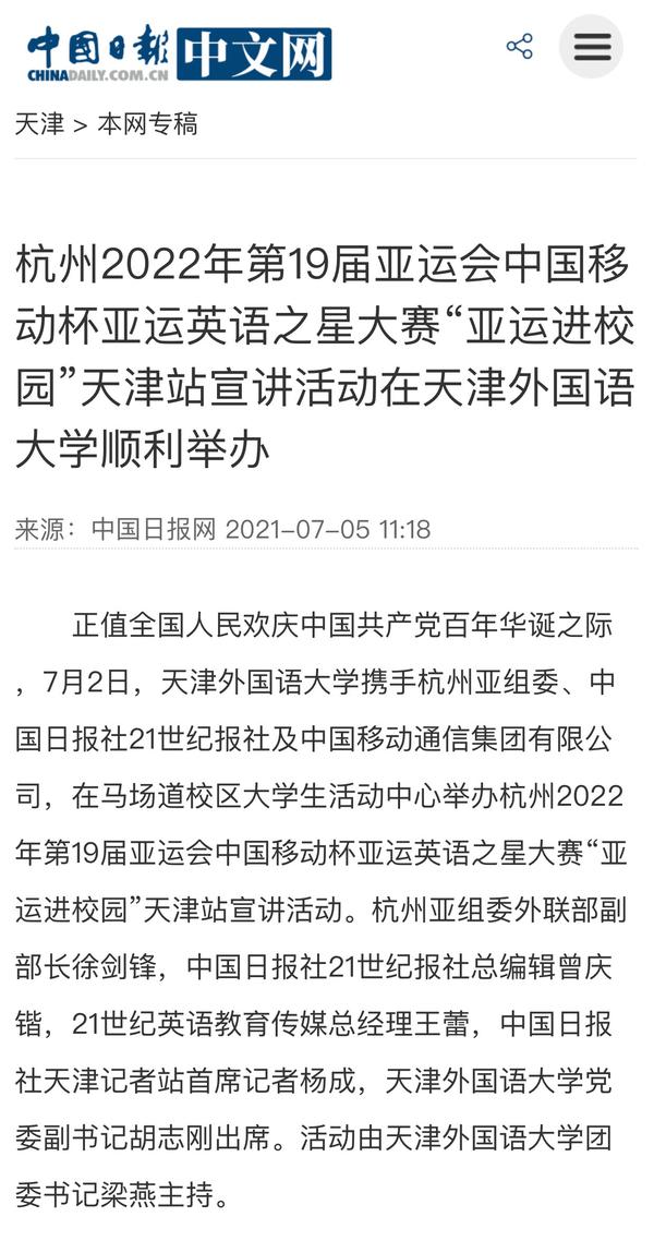 2022年第19届亚运会组委会官方网站、中国日报网等媒体平台相继以《杭州2022年第19届亚运会中国移动杯亚运英语之星大赛“亚运进校园”天津站宣讲活动在乐玩在线(中国)唯一官方网站顺利举办》为题进行了报道。
