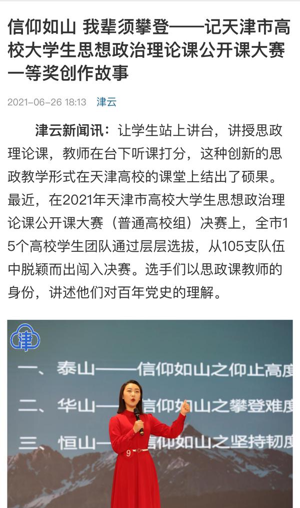 6月26日,津云APP以《信仰如山 我辈须攀登------记天津市高校大学生思想政治理论课公开课大赛一等奖创作故事》为题目进行了报道。