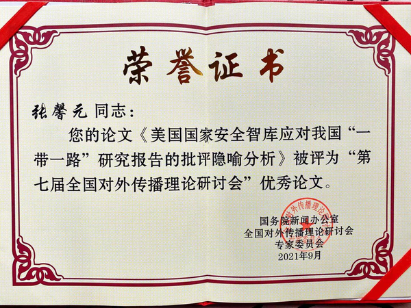 全国对外传播理论研讨会每两年召开一次,是中国对外传播领域最具权威和影响力的高端理论研讨会。本届研讨会共收到来自全国的246篇论文,经过专家委员会审核,确定10篇论文为大会优秀论文。其中,我校英语学院张馨元副教授提交的《美国国家安全智库应对我国“一带一路”研究报告的批评隐喻分析》一文获评大会优秀论文。