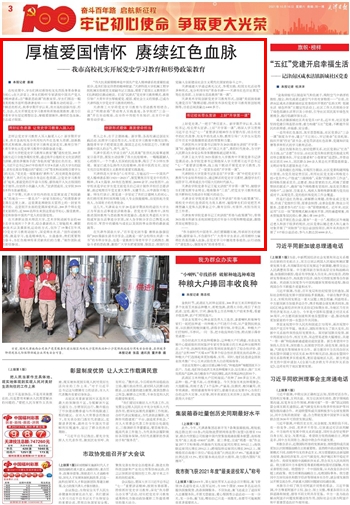 10月16日,《天津日报》3版《厚植爱国情怀 赓续红色血脉──我市高校扎实开展党史学习教育和形势政策教育》一文中,聚焦我校“百年党史润书香 赓续血脉强信仰”2021级新生读书分享会。文章谈到,这既是一场“全校师生共读一本书”的书单分享会,也是一堂教育引导青年学子立鸿鹄志、做奋斗者的思政课,激励广大学生把爱国情、强国志、报国行自觉融入全面建设社会主义现代化国家的奋斗之中。