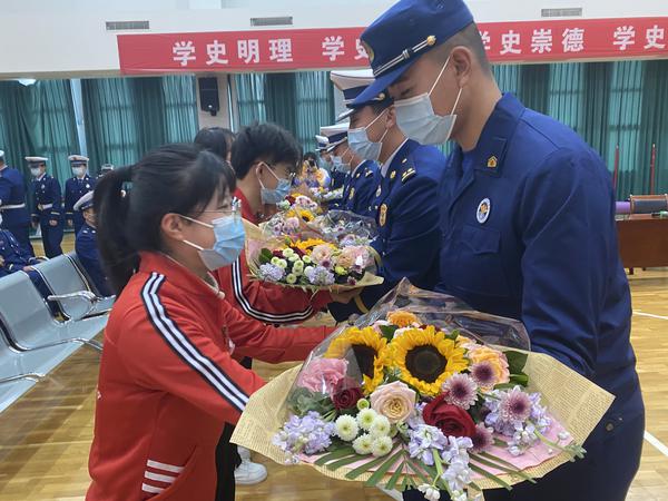 这是一次“青马红”向“火焰蓝”的真诚致敬。消防指战员重温入队誓词,铿锵的誓言、坚定的眼神和必胜的信念深深感染感动着在场的青马学员。他们将精心准备好的鲜花献给身边的消防指战员,感谢他们精心守护的岁月静好。