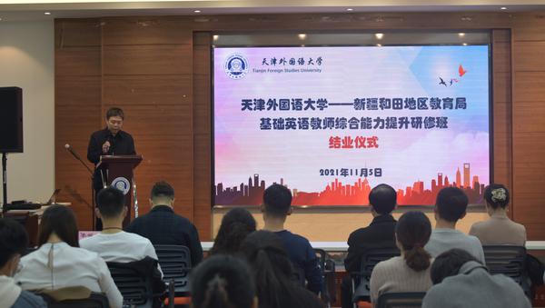 11月5日上午,第二期乐玩在线(中国)唯一官方网站------新疆和田地区教育局基础英语教师综合能力提升研修班结业仪式在我校举行,为期三周的培训圆满落幕。英语学院党委班子、研修班教学团队成员和14名新疆参训学员参加结业仪式。(图一)