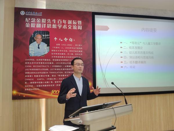 金隄翻译思想学术交流周期间,天津理工大学蒲海丰博士、天津科技大学王振平教授分别以“金隄先生的文学翻译思想有感------当前儿童文学翻译的风格再造”、“金隄的翻译理论与实践”为题做了报告。