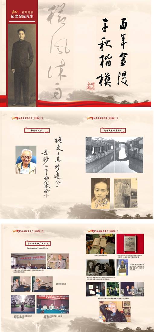 为表达对金先生的缅怀与感佩,英语学院制作《金隄先生百年诞辰纪念册》,从“生平简介”、“翻译成果”、“学术贡献”、“教学理念”、“乔学专家”、“翻译一生”六个方面,以一百三十多幅图片真实展现了金隄先生的工作生活轨迹。