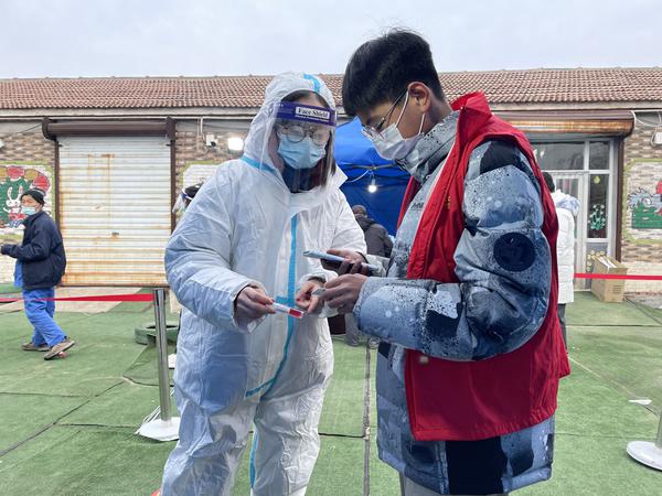 如果说疫情后方是保障,那前线就是战场。市青马学员、国际传媒学院潘星宇所协调负责的蓟州区下营镇赤霞峪村点位于10号凌晨就开始了紧张有序的核酸检测工作,随之而来的是新一轮冷空气的侵袭。她负责登记信息和秩序维持。虽然穿着厚棉衣,但还是会被阵阵冷风吹得发颤。从凌晨到下一个凌晨,她第一次体会到工作到忘记时间、忘记疲惫的感觉,反之周身都被一种莫名的力量所包围,这力量来源于90岁大娘紧紧握住她的手温暖地感谢,来源于孩子们口中稚嫩的问候,来源于隔着防护服依然耀眼的青马红衣……“青”力而为,是一种精神,更是一种责任。我们已经成为战疫中更勇敢些的人,就不会轻易退下阵来。相信中国,相信天津,我们可以战胜!我们终将战胜!