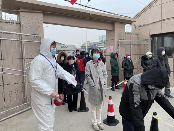 市青马学员、国际商学院洪颖,当1月8日晚上收到紧急流调任务的时候,她立刻重返工作岗位,根据摸排名单挨个进行电话联系。流调工作任务艰巨,在凌晨4点多结束流调准备休息的时候,不断有被调人员打电话咨询,她总是耐心细致地解释。1月10日,静海区进行核酸检测,凌晨4点多洪颖便开始收拾东西前往大邱庄镇李八庄村检测点,穿好防护服,戴上面罩,尽管包裹得严严实实却还是冻得瑟瑟发抖。她的工作主要是对居民进行分组和协助登记并扫描试管,村里的老人小孩众多,她全力帮助没有智能手机的人群进行核酸检测,缓解他们急躁的心情。早五晚十,呼出的热气在面罩上结了冰,室外低温使手机无法开机,一天下来嗓子喊哑了也不敢喝水,手指冻僵了也依旧努力在键盘上敲击,就是为了最快速、准确地做好人员分组和保障医护人员进行检测。