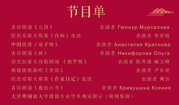同学们精心准备并表演了中俄文诗歌朗诵、民歌演唱、中俄文化主题演讲、民族舞蹈等,节目精彩纷呈,丰富温馨。来自伏尔加格勒国立社会师范大学的汉语专业学生阿娜斯塔西娅十分热爱汉语和中国文化,对中国的传统民乐和民族舞蹈尤感兴趣,她表演的《扇子舞》为线上活动增添了浓浓的节日气氛。