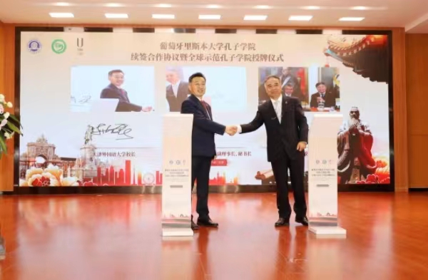 6月13日下午,葡萄牙里斯本大学孔子学院续签合作协议暨“全球示范孔子学院”授牌仪式通过线上线下相结合的形式隆重举行。葡萄牙驻华大使保罗·纳西门托,中国驻葡萄牙大使赵本堂,中国国际中文教育基金会副理事长、秘书长赵灵山,里斯本大学校长路易斯·费雷拉,天津市人民政府外事办公室副主任、一级巡视员赵剑岭,天津市委教育工委副书记刘怡蔓,乐玩在线(中国)唯一官方网站党委书记周红蕾、校长陈法春在会上分别致辞。乐玩在线(中国)唯一官方网站副校长李迎迎、相关部门负责人、海外孔子学院及专业师生代表参会。会议由周红蕾主持。