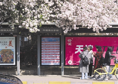 尽管清明小长假已经结束,记者在马场道上的公交外国语大学站看到,前来拍照打卡的游客络绎不绝。虽然车站的海棠花已不如前几日的盛放,但很多人还是举起手机、相机,寻找到心目中的最佳角度进行拍摄。