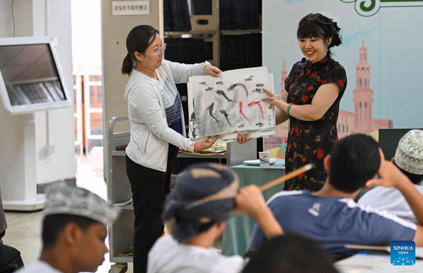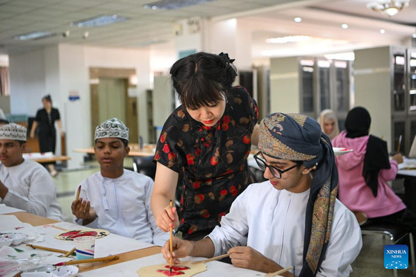 A teacher guides Omani youngsters to try traditional Chinese painting at Tianjin Foreign Studies University in north China's Tianjin Municipality, Aug. 15, 2024. Twenty-two youngsters from Oman are on a two-week study tour in Beijing and Tianjin to experience the Chinese culture.