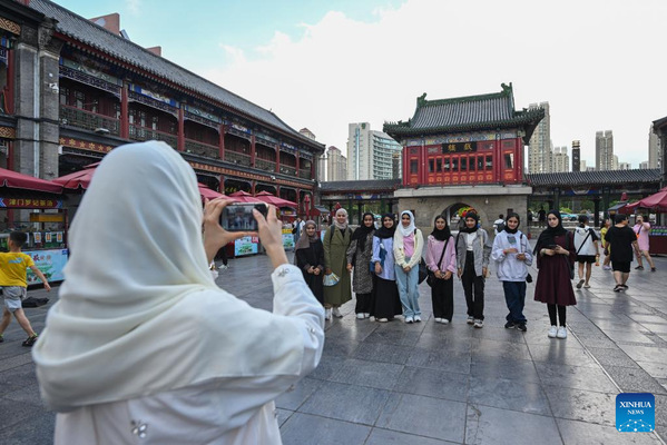 Omani youngsters pose for a group photo at a scenic spot in north China's Tianjin Municipality, Aug. 12, 2024. Twenty-two youngsters from Oman are on a two-week study tour in Beijing and Tianjin to experience the Chinese culture.
