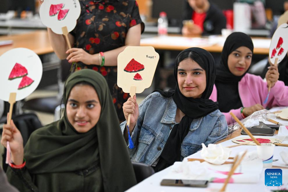 A teacher introduces traditional Chinese paintings to Omani youngsters at Tianjin Foreign Studies University in north China's Tianjin Municipality, Aug. 15, 2024. Twenty-two youngsters from Oman are on a two-week study tour in Beijing and Tianjin to experience the Chinese culture.