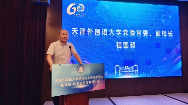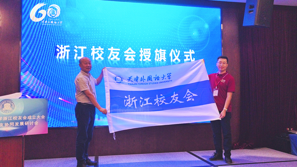 2003级英语专业校友、海伦艺术教育投资有限公司总经理顾箐介绍了浙江校友会的前期筹备情况。会上审议通过了天外浙江校友会章程和第一届理事会名单。在校友们的共同见证下,程国毅代表学校向浙江校友会授旗。新当选的第一届会长——2002级日语专业校友、杭州逸云国芯科技有限公司执行董事兼总经理刘万佳作为校友代表发言。他表示,浙江校友会将秉承“共聚情谊,共享资源,共赢未来”的宗旨,充分发挥校友会的桥梁纽带作用,为校友们提供优质的服务和广阔的交流平台,积极促进母校与浙江的交流与合作,为母校的发展贡献智慧和力量。
