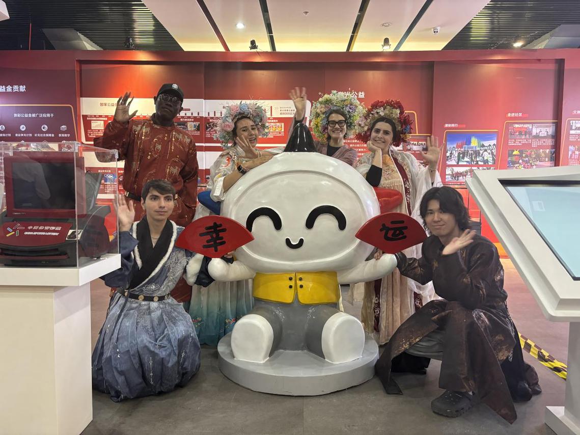 The International Sports Culture Ambassadors visited the China Sports Lottery exhibition area and took photos. Photo by Liu Ying.