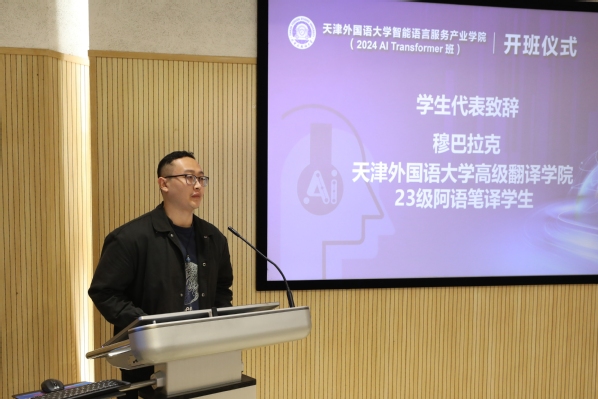 高级翻译学院23级阿语笔译学生穆巴拉克作为产业学院学员代表,分享了自己对人工智能和语言服务的理解与认识,并期待与同学们在相互学习和交流中共同成长,共同探索人工智能与语言服务的无限可能。