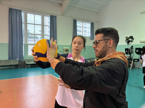 A women's volleyball player provided one-on-one training for international sports culture ambassador Raydis Franco (first on the right).
