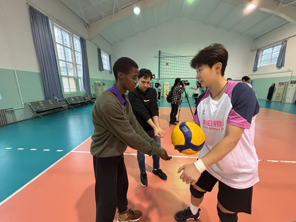 The women's volleyball players, through a series of basic training sessions and real-time practice, explained in detail to the international sports culture ambassadors the correct hand positioning and force techniques for making passes, as well as key skills for serving, including proper stance, arm swing, and hitting point. Under the careful guidance of the coach, the international sports culture ambassadors practiced diligently, constantly correcting their movements, and working hard to grasp these technical essentials.