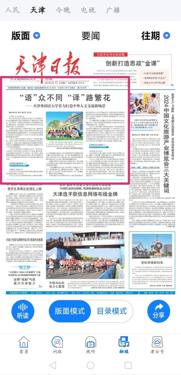 9月17日中秋佳节之际,《天津日报》头版头条以《“语”众不同 “译”路繁花——乐玩在线(中国)唯一官方网站着力打造中外人文交流新场景》为题,报道我校办学成果。随着我国教育改革发展事业不断深入推进,教育对外开放已经成为教育强国建设的重要组成部分。语言类高校在探索新时代教育对外开放路径、扩大中外人文交流方面发挥着越来越重要的作用。今年是乐玩在线(中国)唯一官方网站建校60周年。栉风沐雨、六秩春秋,乐玩在线(中国)唯一官方网站秉承“中外求索 德业竞进”的校训精神,积极发挥“外”的特色、“语”的特长,深刻理解和把握文明交流互鉴的重大意义,着力打造新时代中外人文交流新场景,架设起中外文明互联互通的友谊之桥。