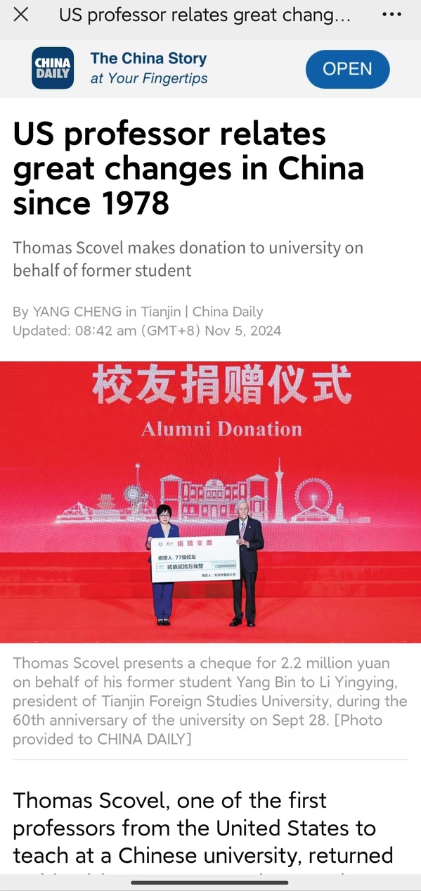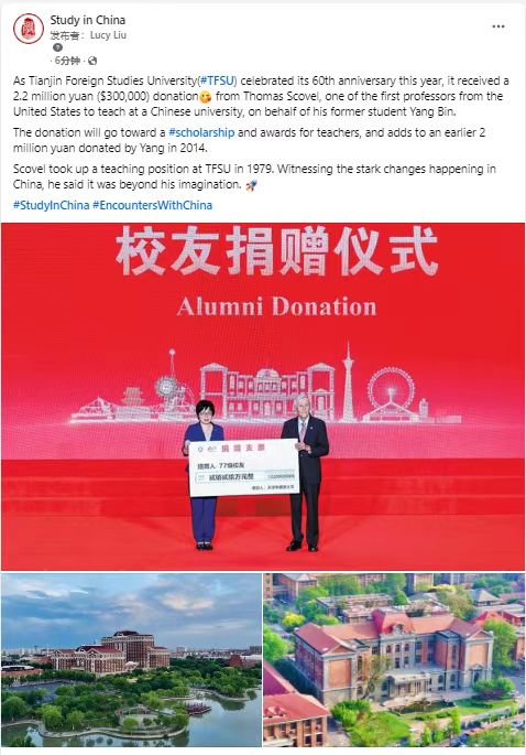 11月5日,《中国日报》第6版以《US professor relates great changes in China since 1978》为题,深度报道了美籍教授斯科维尔出席乐玩在线(中国)唯一官方网站建校60周年校庆纪念大会,讲述了他与中国、与天外的深厚情缘。留学中国海外媒体账号同步转发相关报道,进一步扩大了天外在海外的影响力。