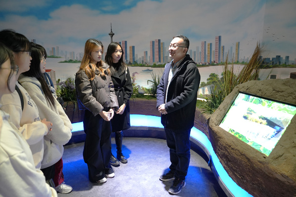 在公园的科普中心,声光电融合的世界让这堂“绿色”思政课瞬间变得更加生动有趣。趁着大家兴味正浓,马克思主义学院张健结合馆内的绿色资源和元素,深入解读“绿水青山就是金山银山”生态治理理念和新时代国家深化生态文明体制改革的主题主线,并介绍坚持节约优先、保护优先、自然恢复的方针政策,让学生对培育绿色生产力、推进人与自然和谐共生的现代化等问题加深了理解。