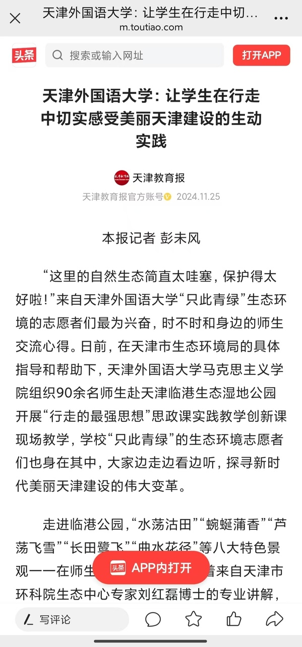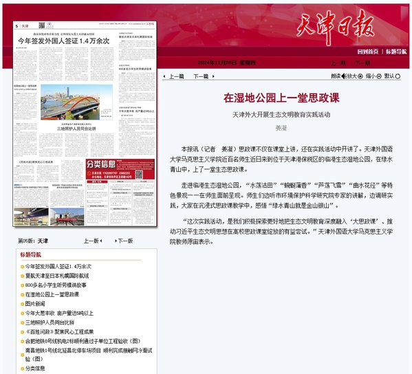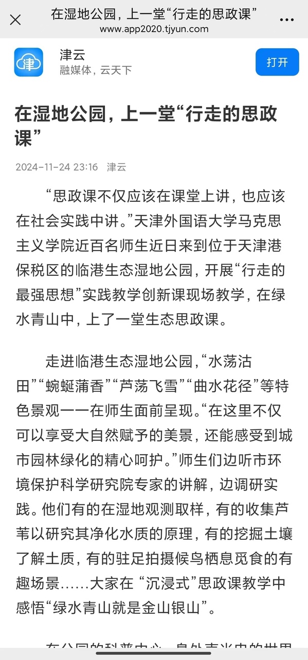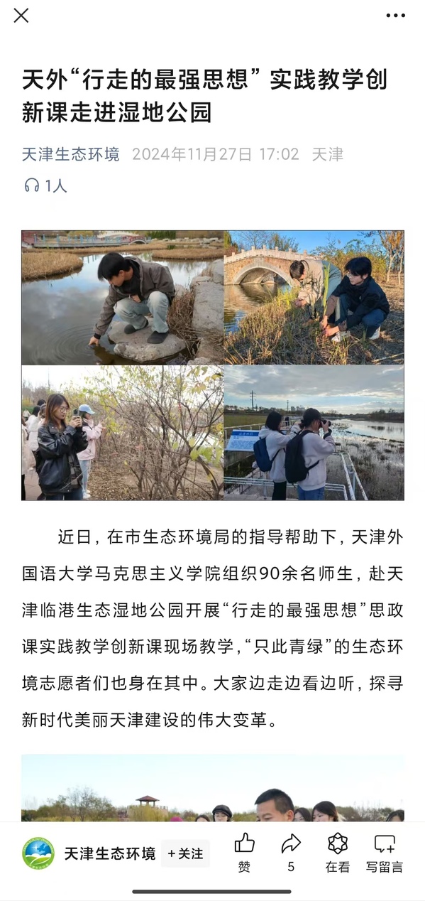 近日,乐玩在线(中国)唯一官方网站马克思主义学院近百名师生来到位于天津港保税区的临港生态湿地公园,开展“行走的最强思想”实践教学创新课现场教学,在绿水青山中,上了一堂生态思政课。这次实践活动是天外积极探索更好地把生态文明教育深度融入“大思政课”、推动习近平生态文明思想在高校思政课堂上美丽绽放的有益尝试。本次活动受到了《中国日报》《天津日报》、津云、《天津教育报》、天津生态环境微信公众号等多家媒体的关注和报道。