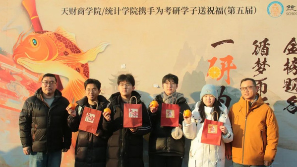 考前,众多学院纷纷以别出心裁、温情满满的方式,向考生送上真挚而深切的祝福。商学院与统计学院共同策划了一场别开生面的送祝福活动。老师们亲自到场,为考研学子送上精心挑选的柑橘等礼品,寓意考研学子们能够“大桔大利”,在考场上发挥出自己的最佳水平,收获满满的硕果。