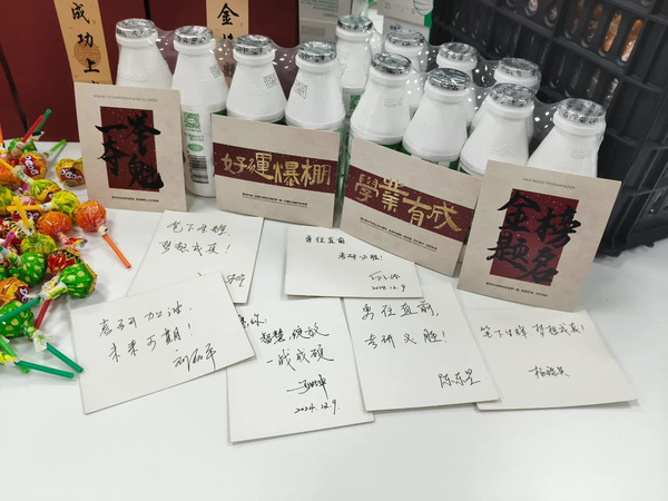 考前,天津医科大学药学院精心准备了满载深情厚意的“梦想启航”礼包,一颗颗饱满鲜亮、光泽诱人的橙子寄托了“心想事‘橙’ 成功上岸”的温馨寄语;棒棒糖与娃哈哈AD钙奶,是为了给考生带去一丝甜蜜、一份快乐。“笔下生辉、梦想成真”“考研加油、未来可期”“智慧绽放、一战成‘硕’”“勇往直前、考研必胜”……药学院的博士生导师与硕士生导师们在活动现场为考生们写下美好祝愿。