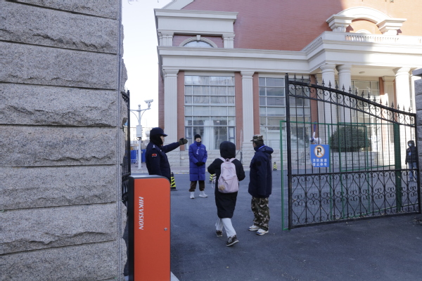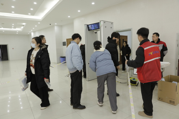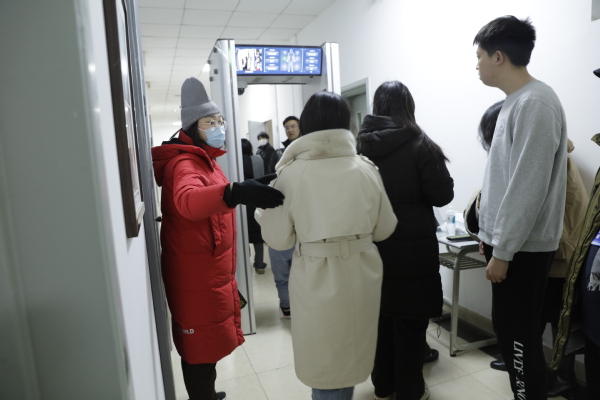 寒冬中,为保障1010名考生快速、精准到达考场,学校特别设置体育馆为考生入场的集中场地。体育馆设置6条人脸识别通道,逸夫楼设置5条人脸识别通道,保证考生有序入场。