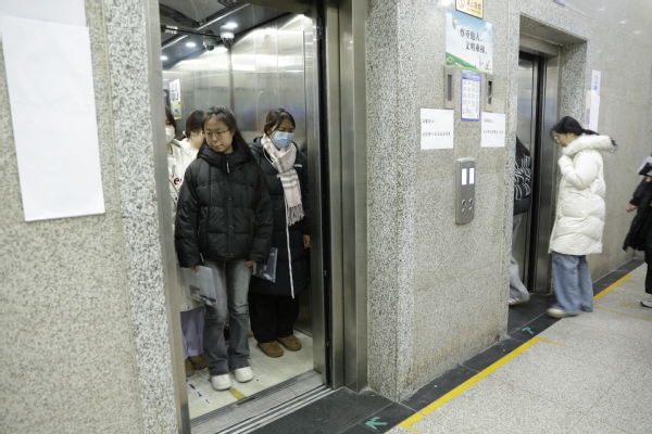 考生们通过安检后,按照引导员、指示牌的指引,有序地乘坐电梯,到达考场,并进行考前检查,按时考试。