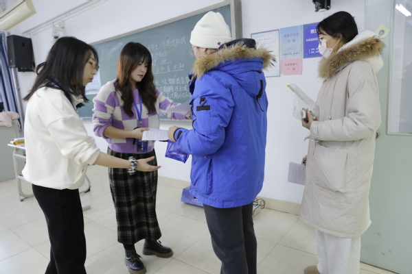 监考教师们今晨很早就来到考务办领取试卷,上午考试结束后又及时交回试卷,确保考务工作高效有序进行。