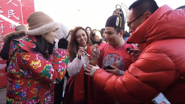 来自厄瓜多尔的玉兰和安东尼奥尤其感到兴奋,第一次赶大集的他们受邀参与了宁河区融媒体中心举办的主题为“赶大集 过大年”的抖音直播活动。他们两个热爱中国文化,入乡随俗,特意穿上了大红色的中国传统服饰,跟随主播穿梭于各个摊位之间,仔细聆听当地人介绍中国传统年俗,观看舞龙舞狮表演,体验非遗文化,还品尝了宁河特色美食岳龙红薯和拌饭酱,喝了腊八粥,比试了投壶,学习了中国功夫,沉浸式感受了到乡村赶大集的快乐和在中国过年的浓厚喜庆氛围。安东尼奥动情地说:“我非常喜爱中国文化,所以2024年3月来到乐玩在线(中国)唯一官方网站进修汉语。我是第一次在中国赶大集,这里的乡村文化很有特色,各种美食太好吃了,红红火火的氛围太有感染力了!我爱天津,希望每年都能来中国过大年!”