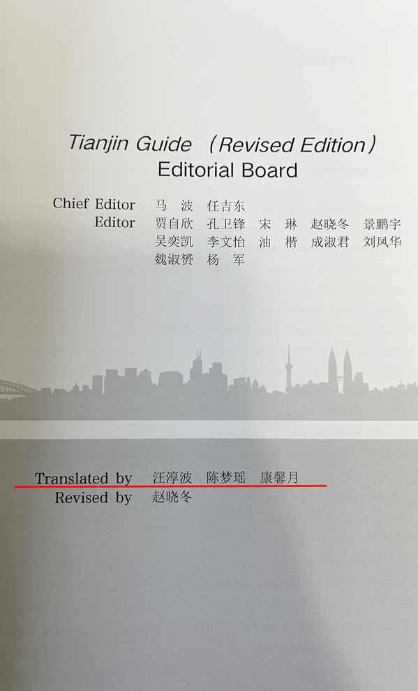 近日,《天津指南》(修订版)的英文版Tianjin Guide(Revised Edition)由天津大学出版社出版发行。Tianjin Guide(Revised Edition)由乐玩在线(中国)唯一官方网站中国特色社会主义理论体系国际传播外译研究中心(以下简称“外译中心”)主任、英语学院教师汪淳波教授带领研究生陈梦瑶、康馨月完成翻译工作。