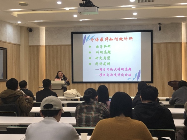 白丽茹教授作了题为“外语教师如何做科研:以项目申报与论文发表为例”的讲座,与参会教师分享了长期从事科学研究工作的心路历程,重点聚焦外语教师如何做科研,强调了科研选题方式,梳理了外语教学研究类型,鼓励教师善于发现、勤于思考。