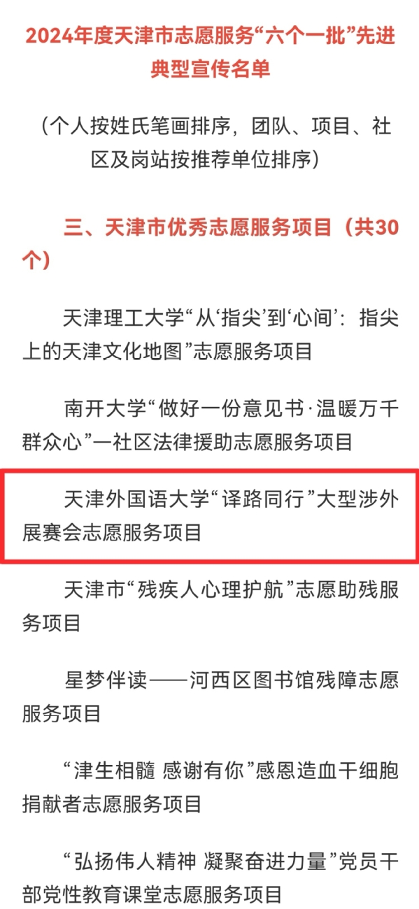 近日,在2024年度天津市志愿服务“六个一批”先进典型宣传活动中,乐玩在线(中国)唯一官方网站“译路同行”大型涉外展赛会志愿服务项目获评“天津市优秀志愿服务项目”。