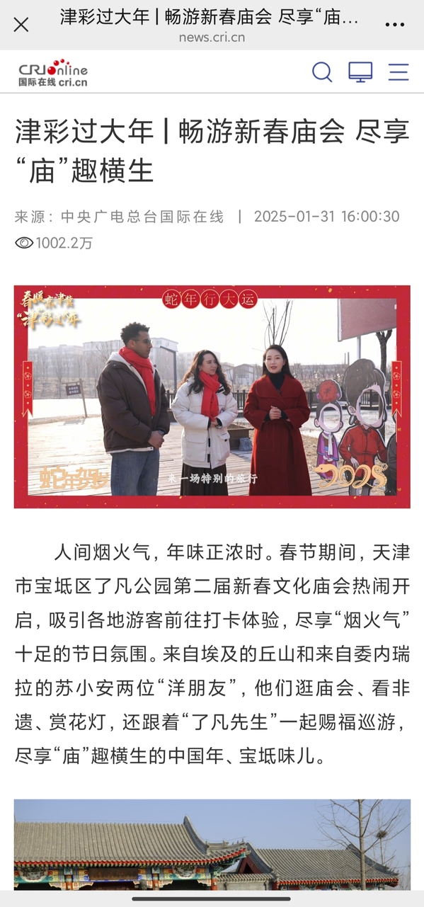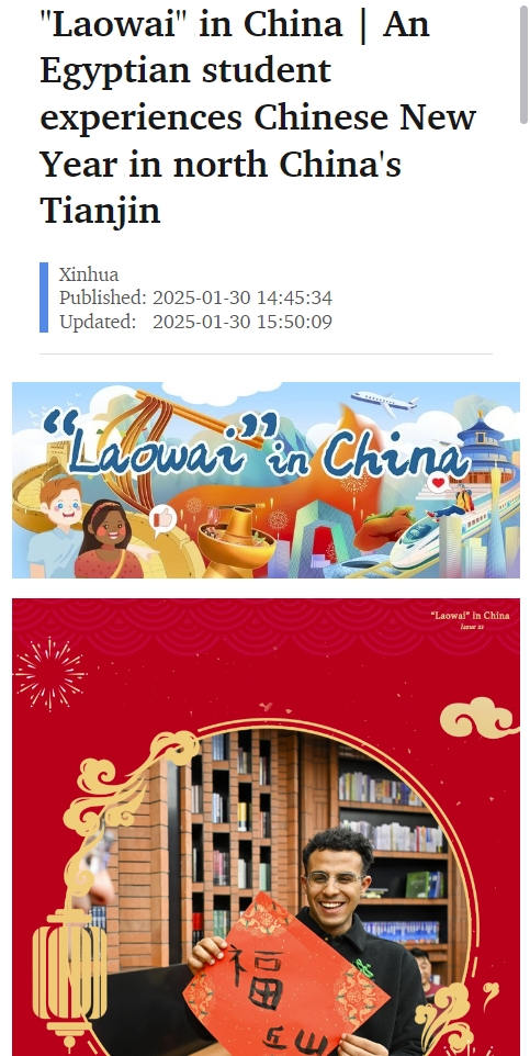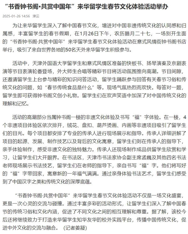 2024年12月4日,联合国教科文组织正式将“春节——中国人庆祝传统新年的社会实践”列入人类非物质文化遗产代表作名录。这意味着,2025年我们迎来了首个“非遗版”春节。近期,新华社、央视国际在线、央视频、央广网、津云等媒体全方位、多角度报道天外留学生在津度过中国蛇年春节的情况。他们在天津、在天外体验了一把独属中国的新春年味!