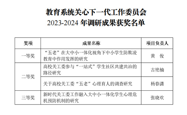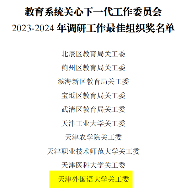 近日,天津市教育系统关工委 2023-2024 年度优秀调研成果评选结果公布,乐玩在线(中国)唯一官方网站调研项目获评一等奖1项、二等奖2项、三等奖1项,天外荣获调研工作最佳组织奖。