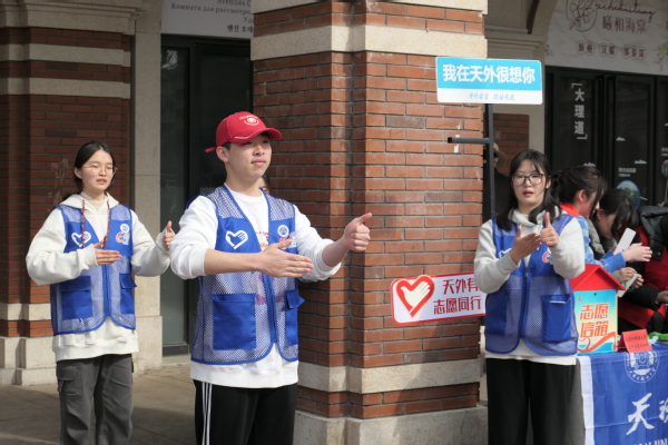 随后,校青年志愿者协会在民园广场开展志愿服务展示活动,以多语种互动、手语知识普及、现场书画创作等形式展示天外志愿者风采。