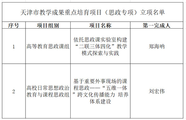 近日,天津市教育科学规划领导小组办公室发布《关于公布天津市教学成果重点培育项目(思政专项)立项的通知》(津教科规办〔2025〕01号),我校郑海呐教授主持的高等教育思政课组项目、刘宏伟教授主持的高校日常思想政治教育与课程思政组项目成果成功获批立项,展现了学校在思想政治教育领域的创新探索与实践成效。